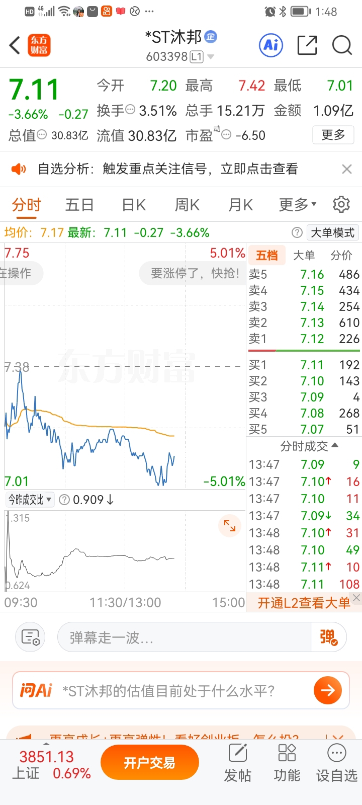 $*ST沐邦(SH603398)$ 沐邦此价卖出也没任何意义了,套住的就拿好,没有只跌不涨之股。$*ST聆达(SZ300125)$ $*ST东易(SZ002713)$