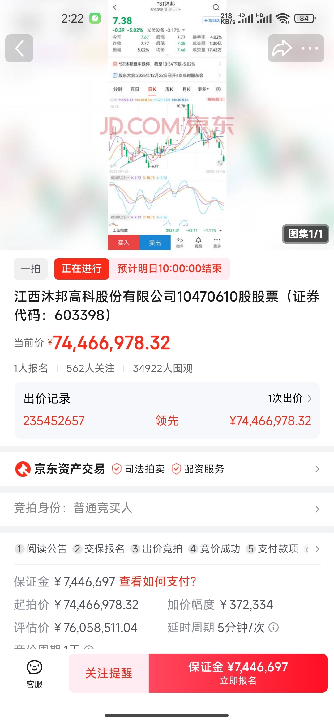 $*ST沐邦(SH603398)$ 涨停了?突然想到是不是有人报名竞拍了?去看了一下还真是有人报名竞拍了?盲猜一下,还是江西国资拍下的,拭目以待吧?明天出结果。