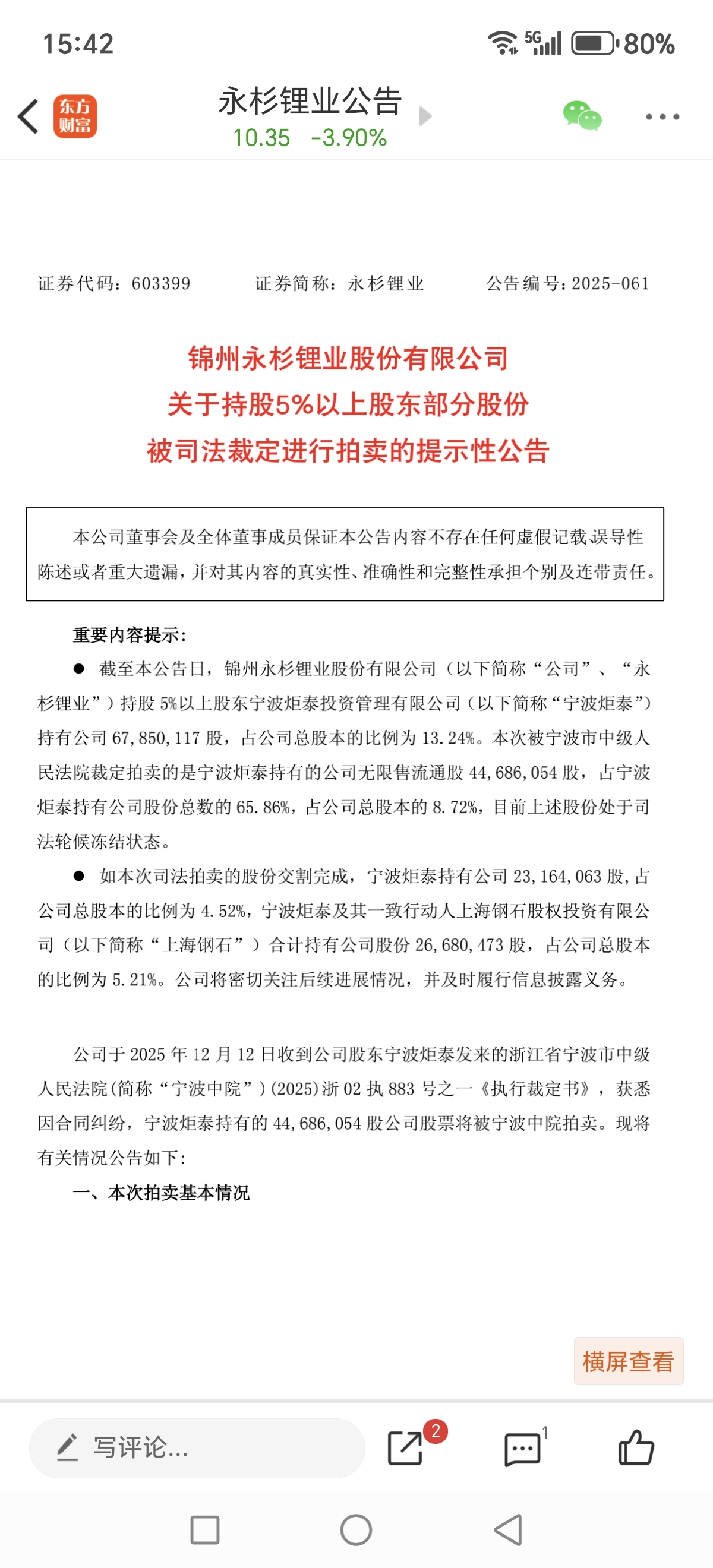 $永杉锂业(SH603399)$ 难怪今天大跌,是第二大股东的股份又要被司法拍卖?