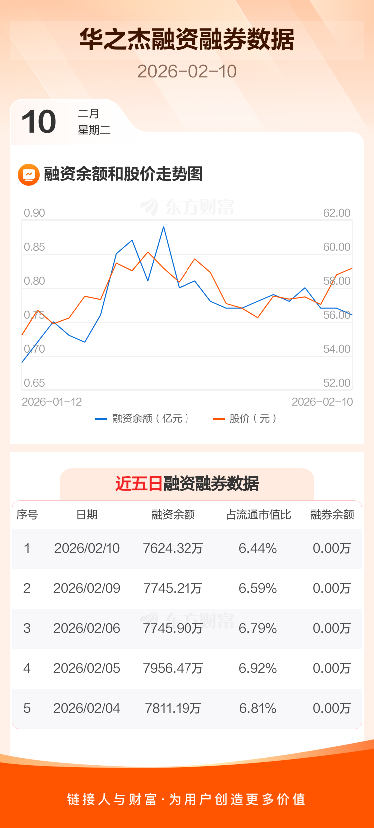 交易所最新数据显示,华之杰于2026年2月10日获融资买入266.08万元,融资偿还386.96万元,当日融资净偿还120.88万元。目前,该股融资余额7624.32万,占流通市值比例为6.44%。