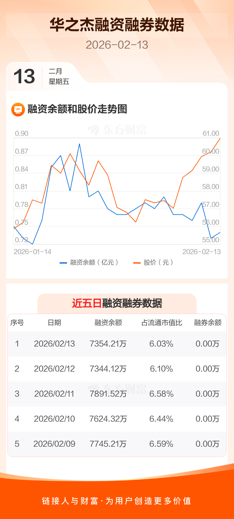 交易所最新数据显示,华之杰于2026年2月13日获融资买入717.83万元,融资偿还707.74万元,当日融资净买入10.09万元。目前,该股融资余额7354.21万,占流通市值比例为6.03%。