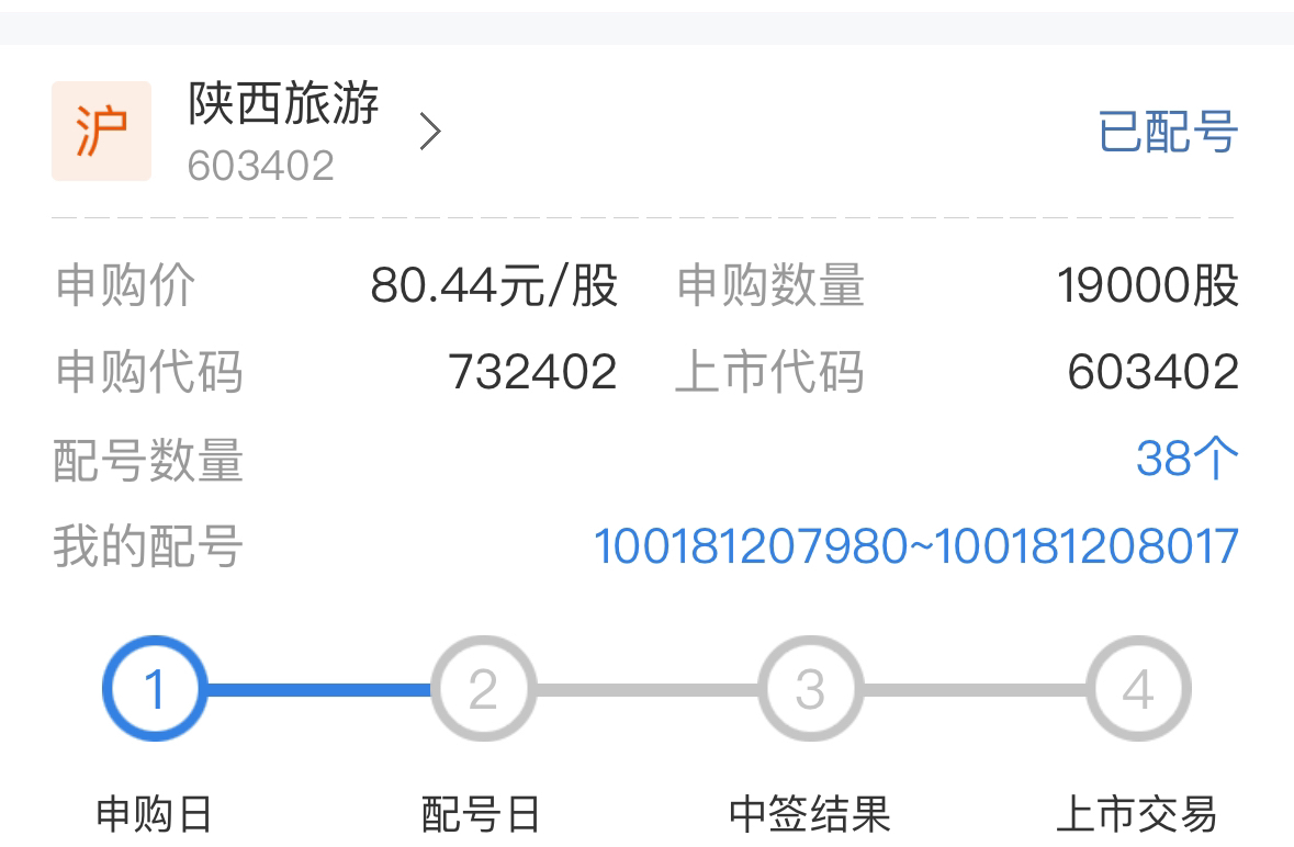 $陕西旅游(SH603402)$ 晒号中签!天灵灵地灵灵,让我中签好不好!