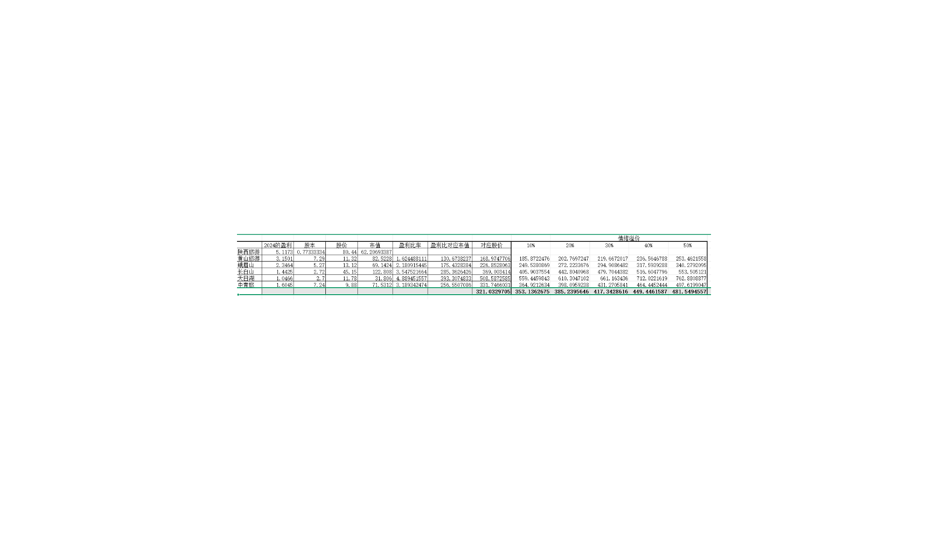 陕西旅游去年赚的钱是 -黄山旅游的近两倍。峨眉山的2.5倍多。长白山的三到四倍。天目湖的五倍。中青旅的三倍多。通过静态分析与上述同行业股票的净利润比较,反算出对应 市值,再算出大致股价,并考虑适当的情绪而得。