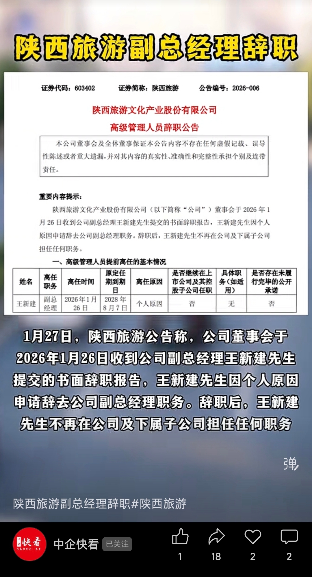 $陕西旅游(SH603402)$ 上市没几天副总经理辞职