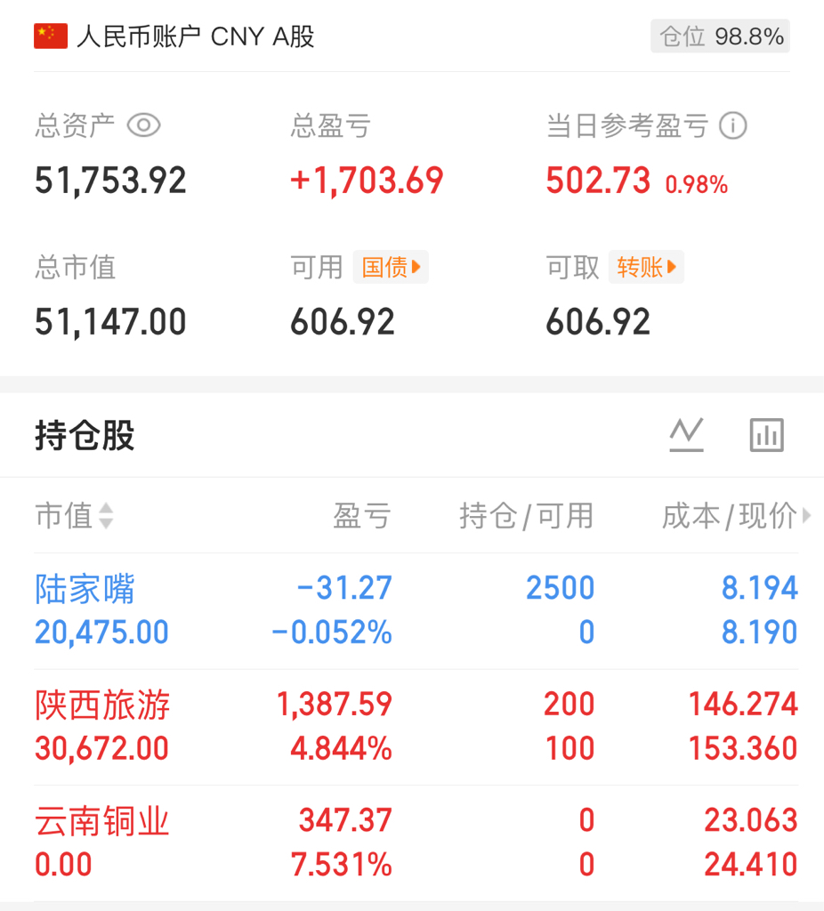 $陕西旅游(SH603402)$ 加了一百股,坐等翻倍,顺便买了点陆家嘴,一个地产一个旅游
