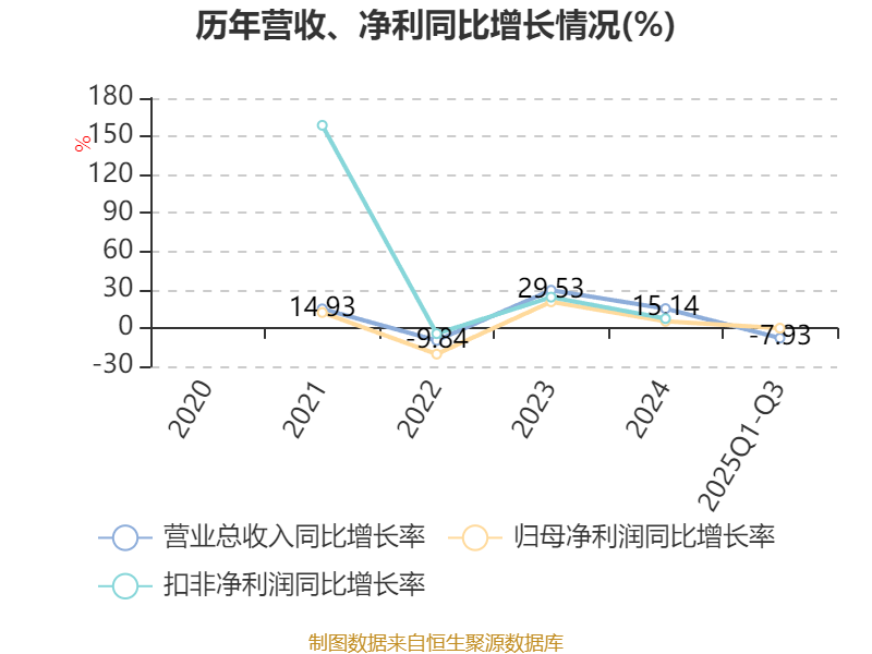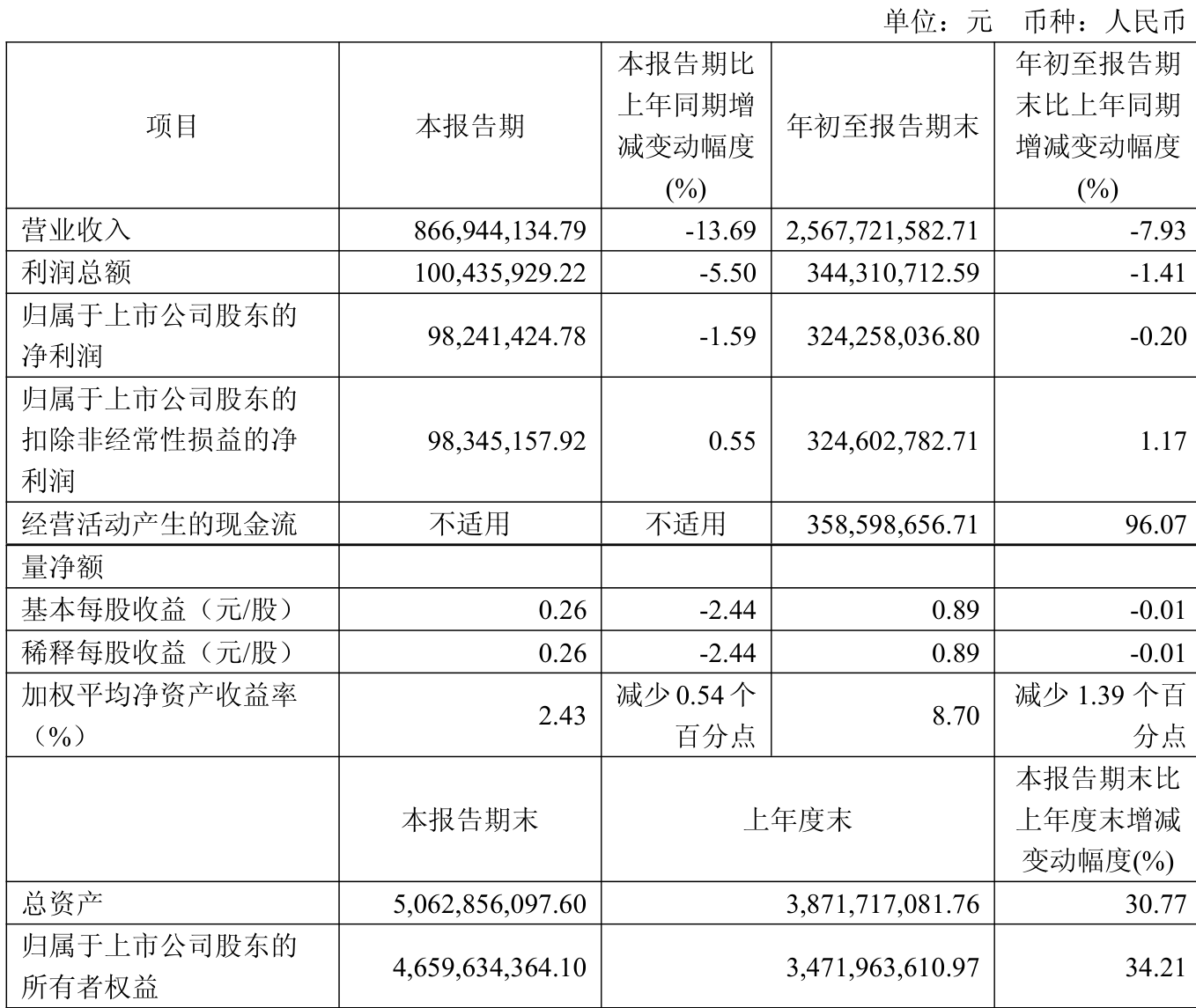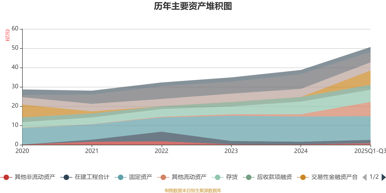 资产重大变化方面,截至2025年三季度末,公司交易性金融资产合计占公司总资产的14.47%,上年末为0;其他流动资产较上年末增加556.94%,占公司总资产比重上升11.74个百分点;固定资产较上年末减少6.16%,占公司总资产比重下降9.53个百分点;货币资金较上年末减少28.77%,占公司总资产比重下降8.94个百分点。