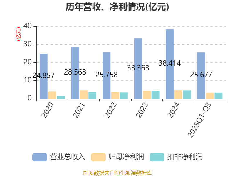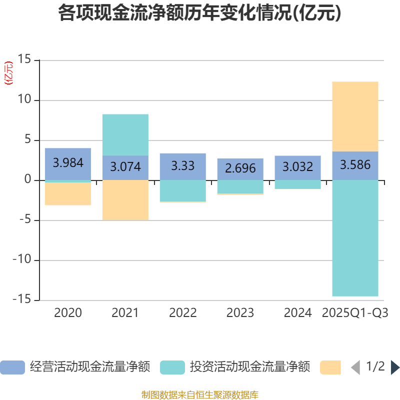 2025年前三季度,公司经营活动现金流净额为3.59亿元,同比增长96.07%;筹资活动现金流净额8.71亿元,同比增加8.22亿元;投资活动现金流净额-14.55亿元,上年同期为-9460.32万元。