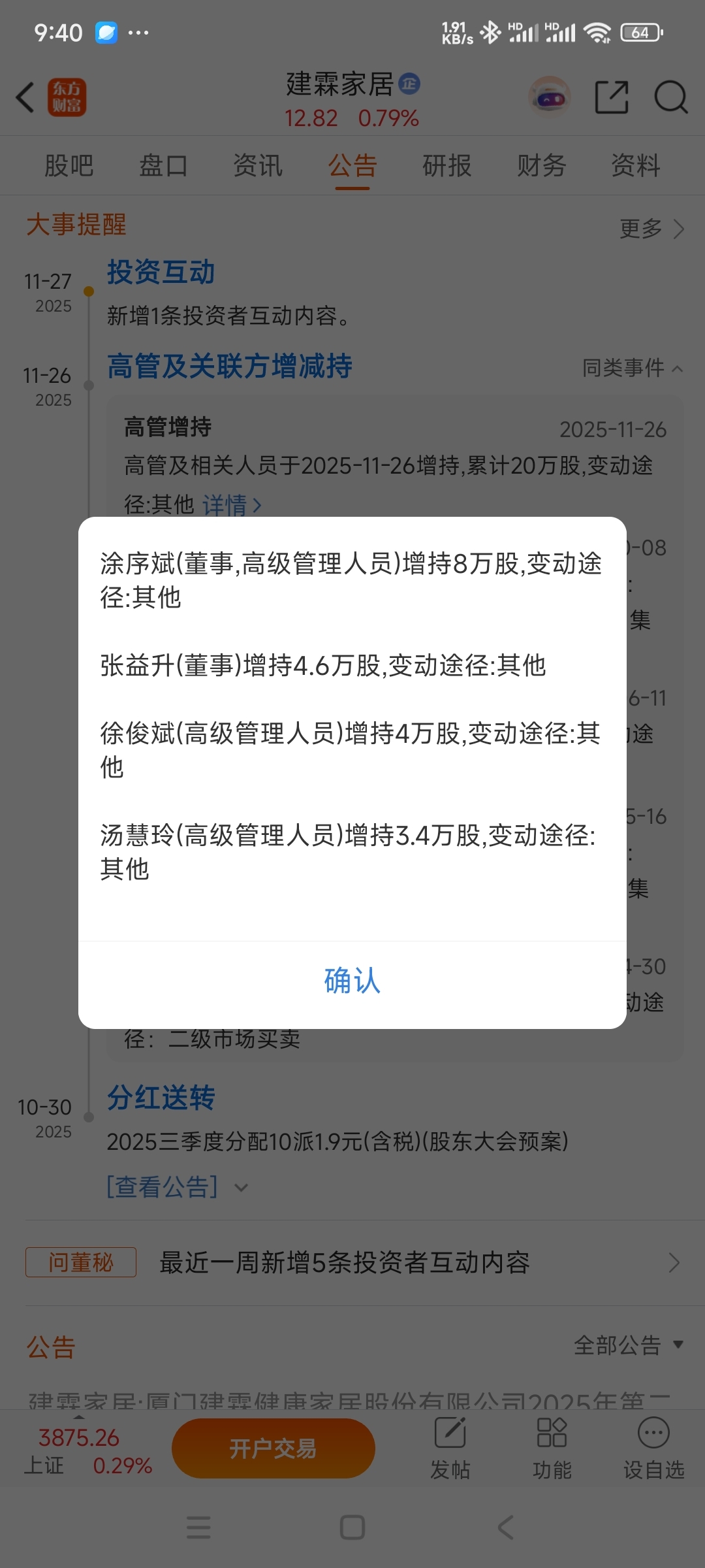 $建霖家居(SH603408)$ 董事高管偷偷买股票不要公告的吗