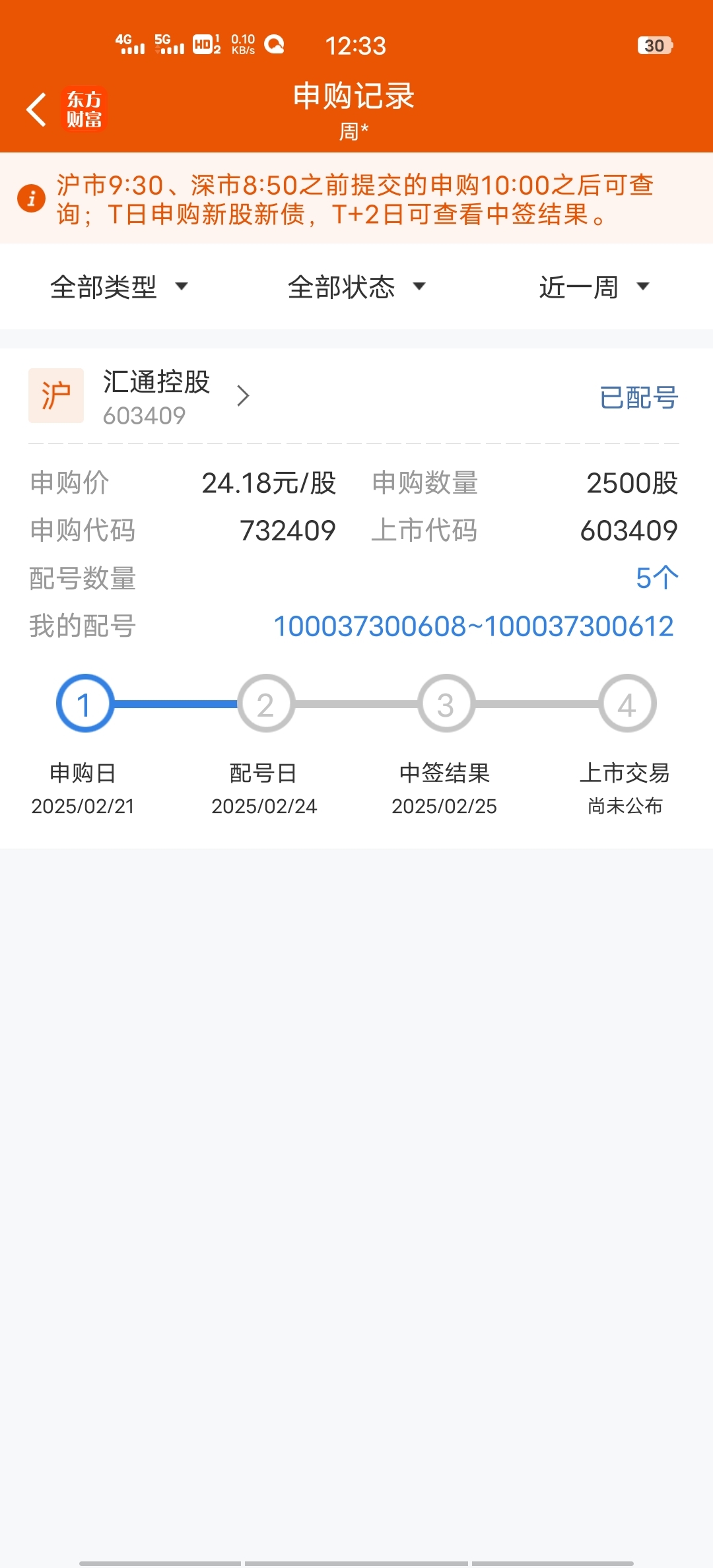 $汇通控股(SH603409)$ 大佬们,这配号还有机会中吗?
