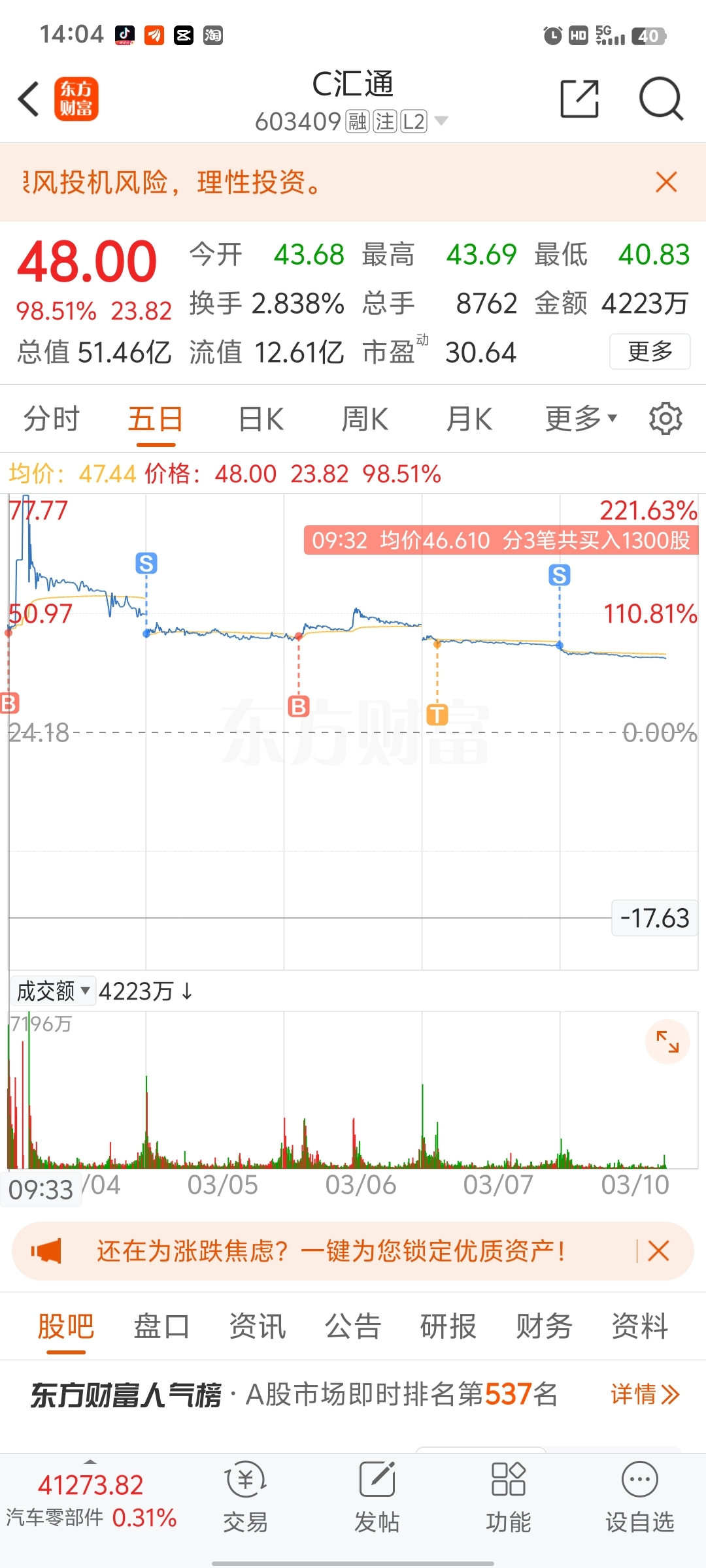 $C汇通(SH603409)$ 新股,拿了5天最后只能割肉,亏了5个点