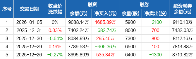 汇通控股:融资净买入1685.89万元,融资余额9088.14万元(01-05)