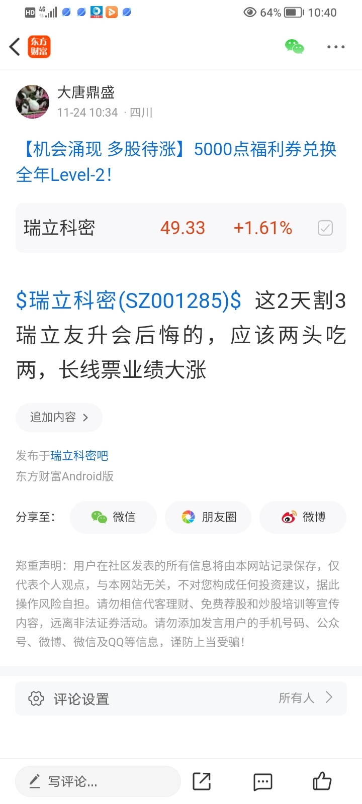 温馨提示: 1.根据《证券法》规定,禁止编造、传播虚假信息或者误导性信息,扰乱证券市场;2.用户在本社区发表的所有资料、言论等仅代表个人观点,与本网站立场无关,不对您构成任何投资建议。用户应基于自己的独立判断,自行决定证券投资并承担相应风险。《东方财富社区管理规定》