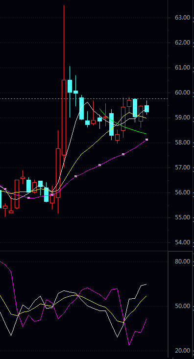 阻力二 59.87 阻力一 59.50 均 价 59.30 支撑一 58.93 支撑二 58.73