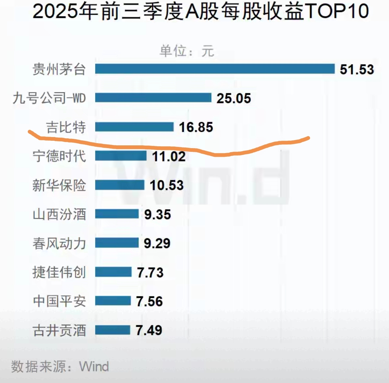 进入了今年A股市场每股利润前三名(见截图),比宁王还多,仅次于茅台和九号公司