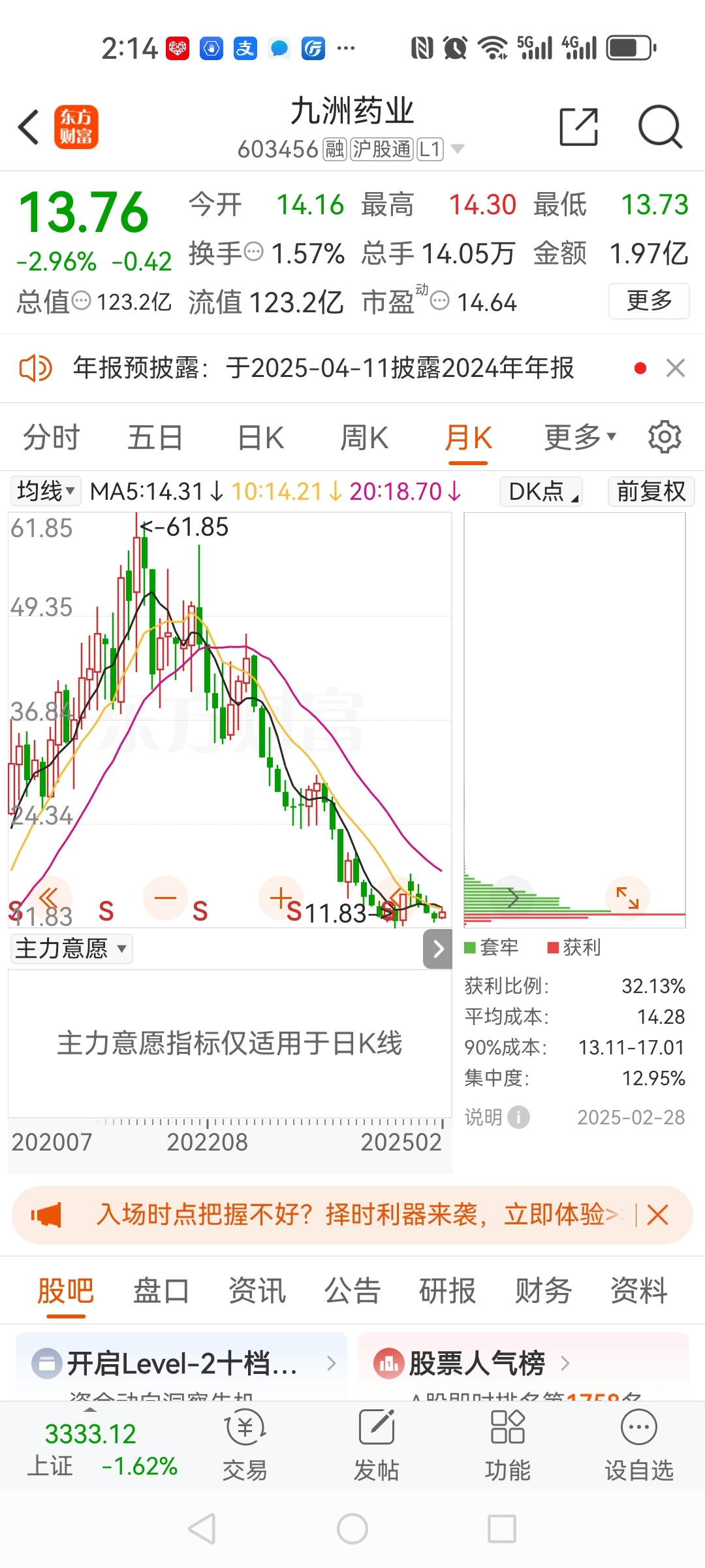$九洲药业(SH603456)$ 这样的走势,公司能正常吗?去年的股票大部分都是上涨的