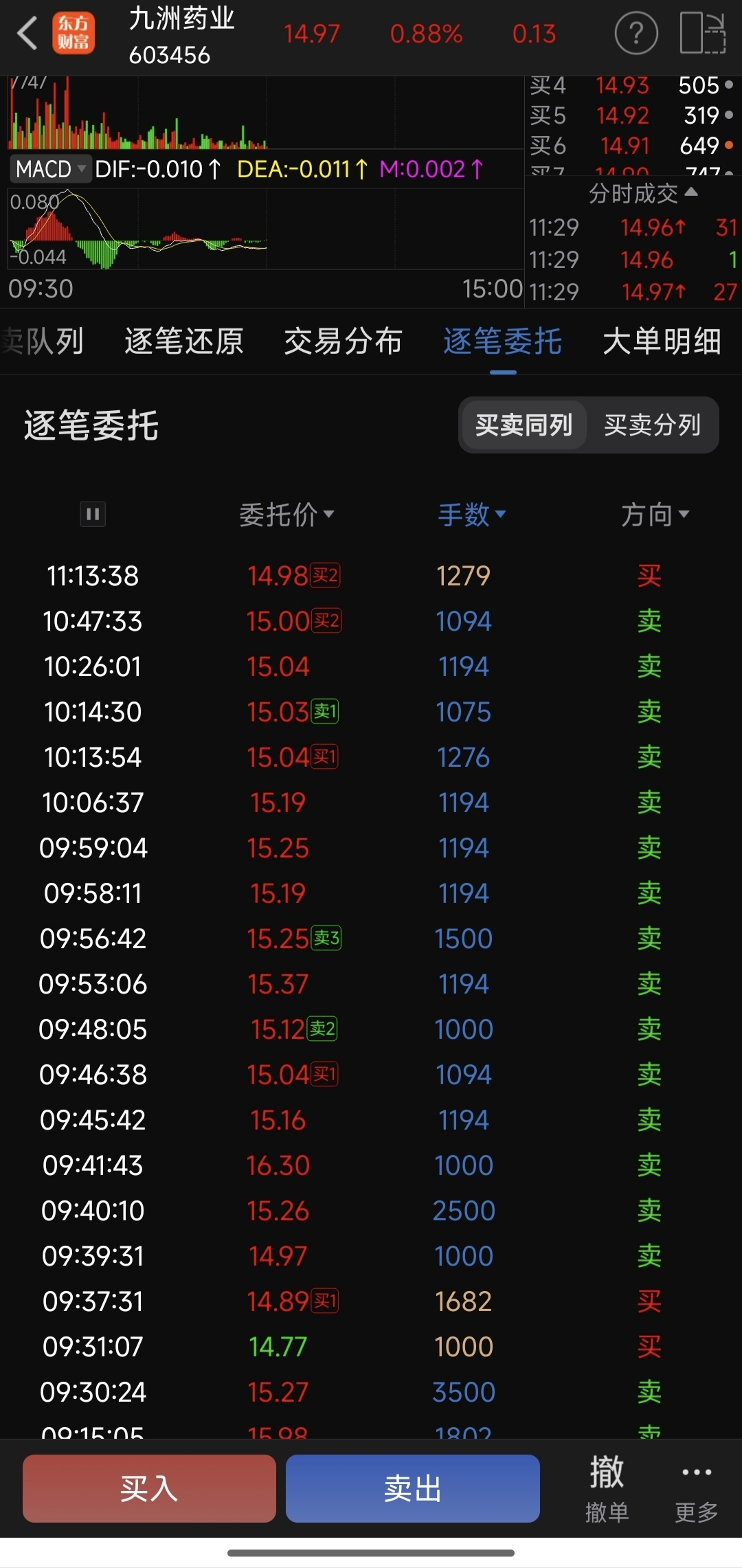 $九洲药业(SH603456)$ 今天大资金搞什么玩意呢?一直大单卖,没放量也不像出货啊!