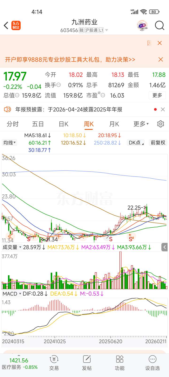 $九洲药业(SH603456)$ 这玩意周线走势不对劲,圆弧顶的样子,有什么大雷吗?为什么别的CRO业绩都那么好,这货四季度连1.5亿都赚不到?