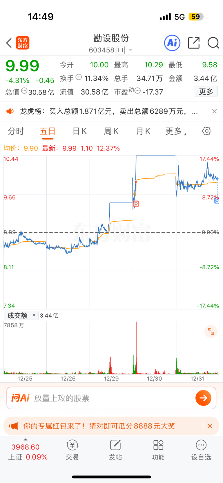 $勘设股份(SH603458)$ 两次拉高没出,也不知道哪个cs砸的,一天都没翻红,还是怪自己太贪。