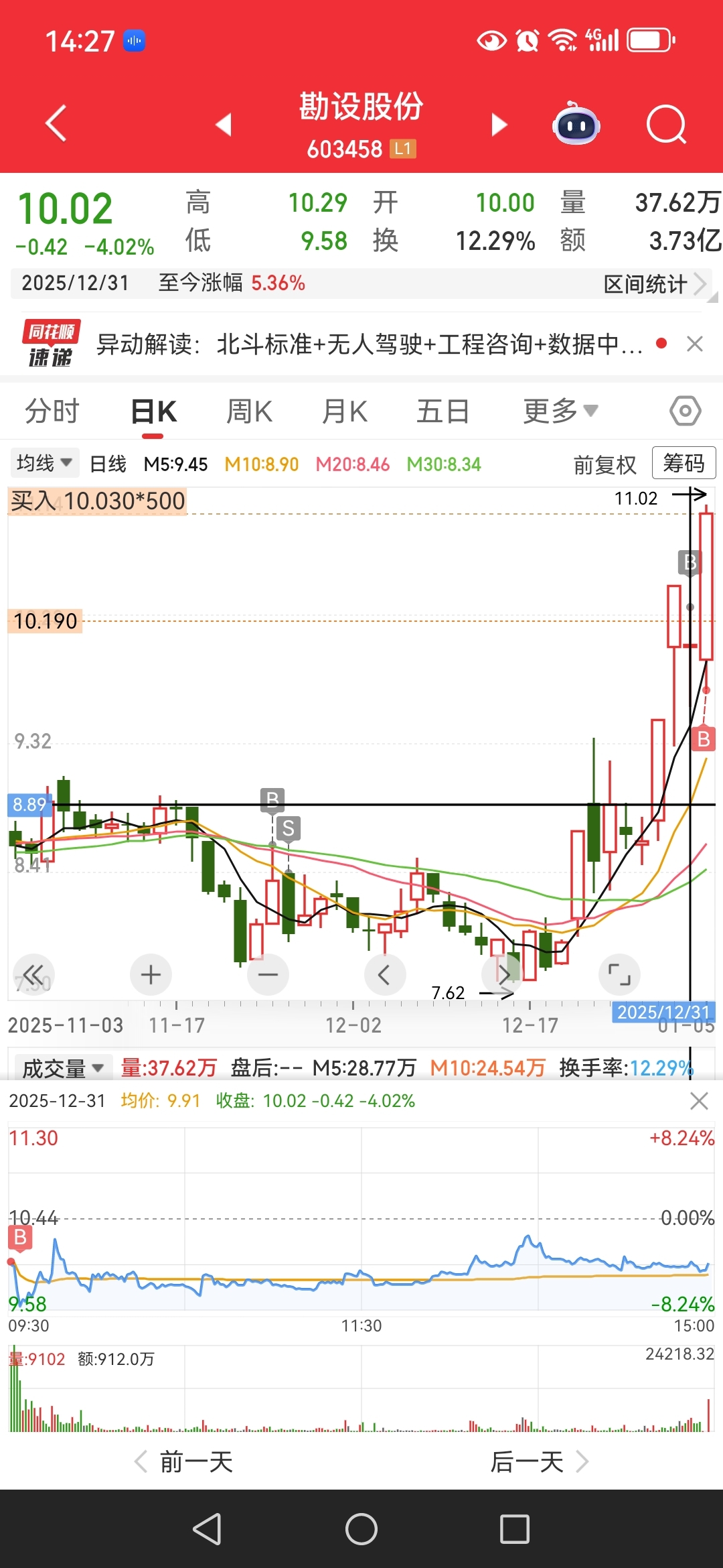 $勘设股份(SH603458)$ 和ST天龙一样,上周三刚进来,开启全利润模式!明天勘设能一个钟内涨停,跨年妖就是你!