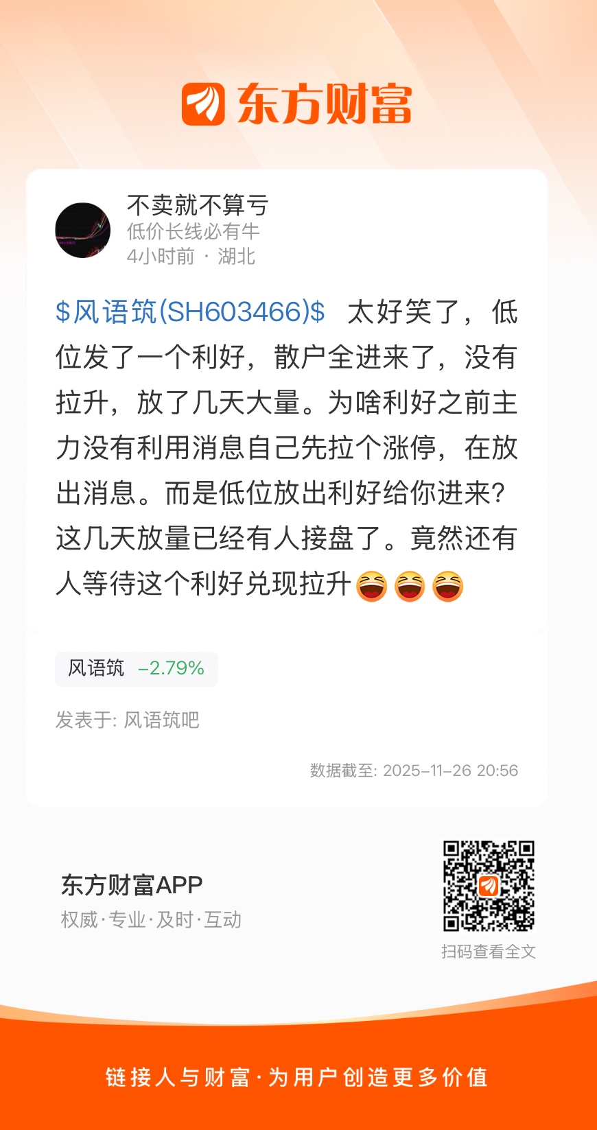$风语筑(SH603466)$ 太好笑了,低位发了一个利好,散户全进来了,没有拉升,放了几天大量。为啥利好之前主力没有利用消息自己先拉个涨停,在放出消息。而是低位放出利好给你进来?这几天放量已经有人接盘了。竟然还有人等待这个利好兑现拉升
