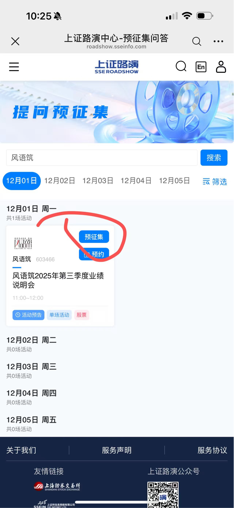 下周开业绩说明会,微信进上证路演中心,点右下侧预征集,搜风语筑点图片预征集,提出