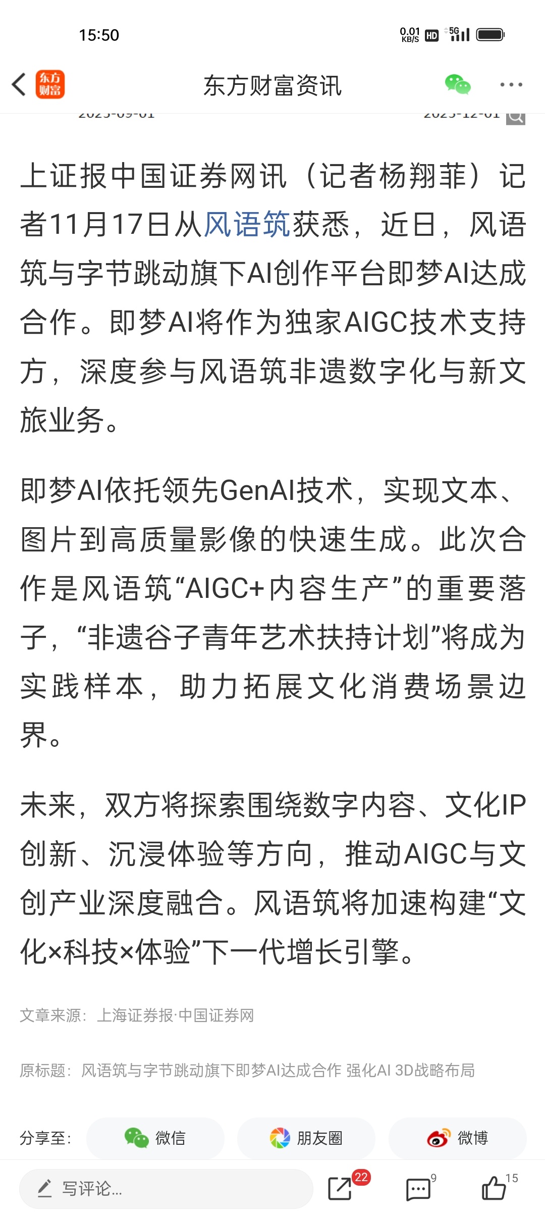 $风语筑(SH603466)$ 风雨筑和字节合作,明天一字板