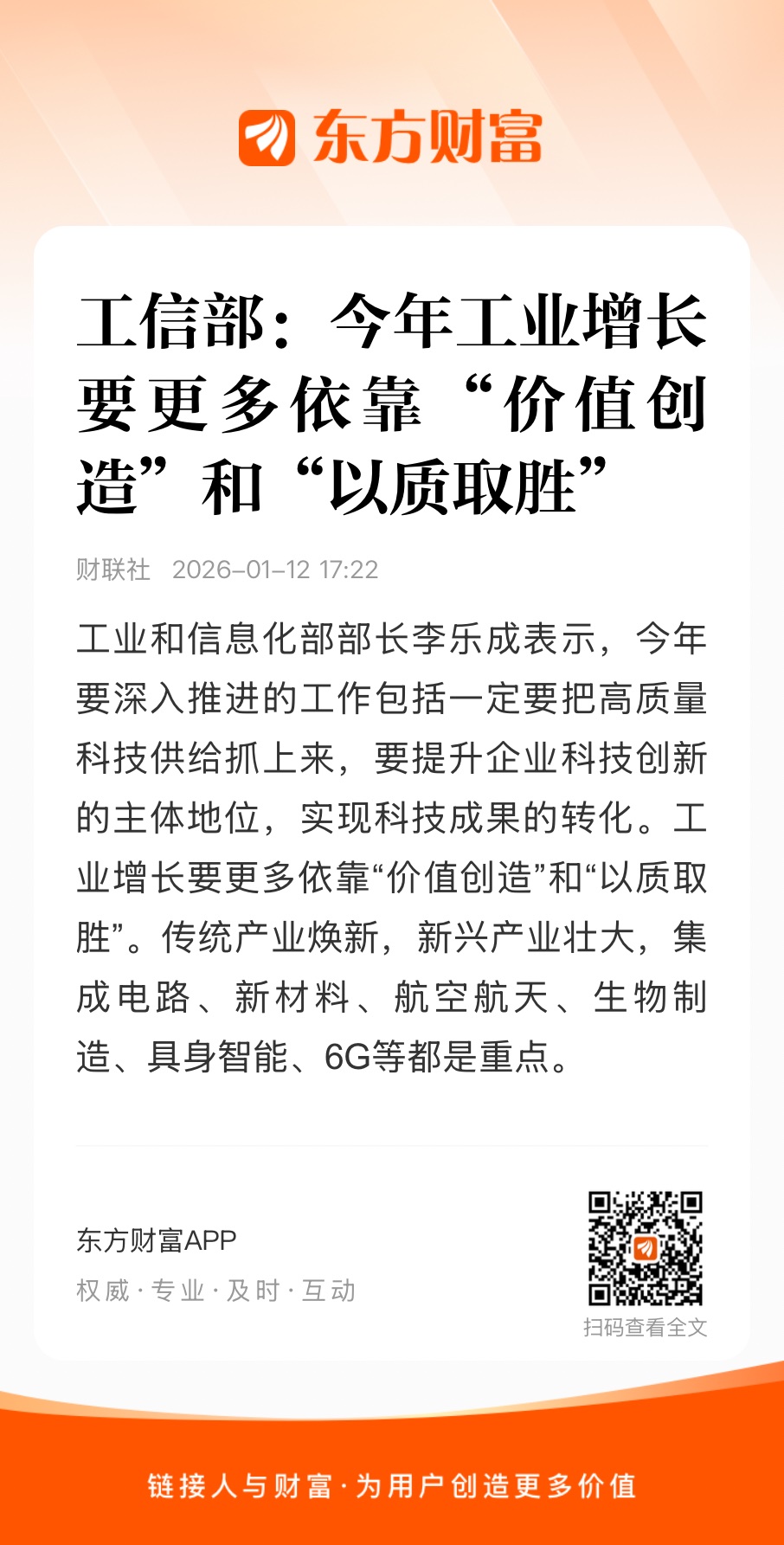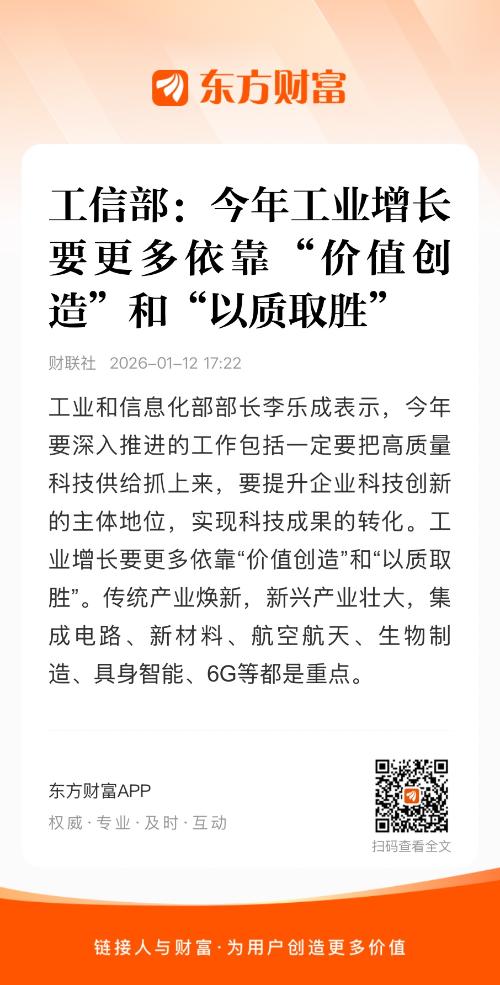 工业和信息化部部长李乐成表示,今年要深入推进的工作包括一定要把高质量科技供给抓上来,要提升企业科技创新的主体地位,实现科技成果的转化。工业增长要更多依靠“价值创造”和“以质取胜”。传统产业焕新,新兴产业壮大,集成电路、新材料、航空航天、生物制造、具身智能、6G等都是重点。