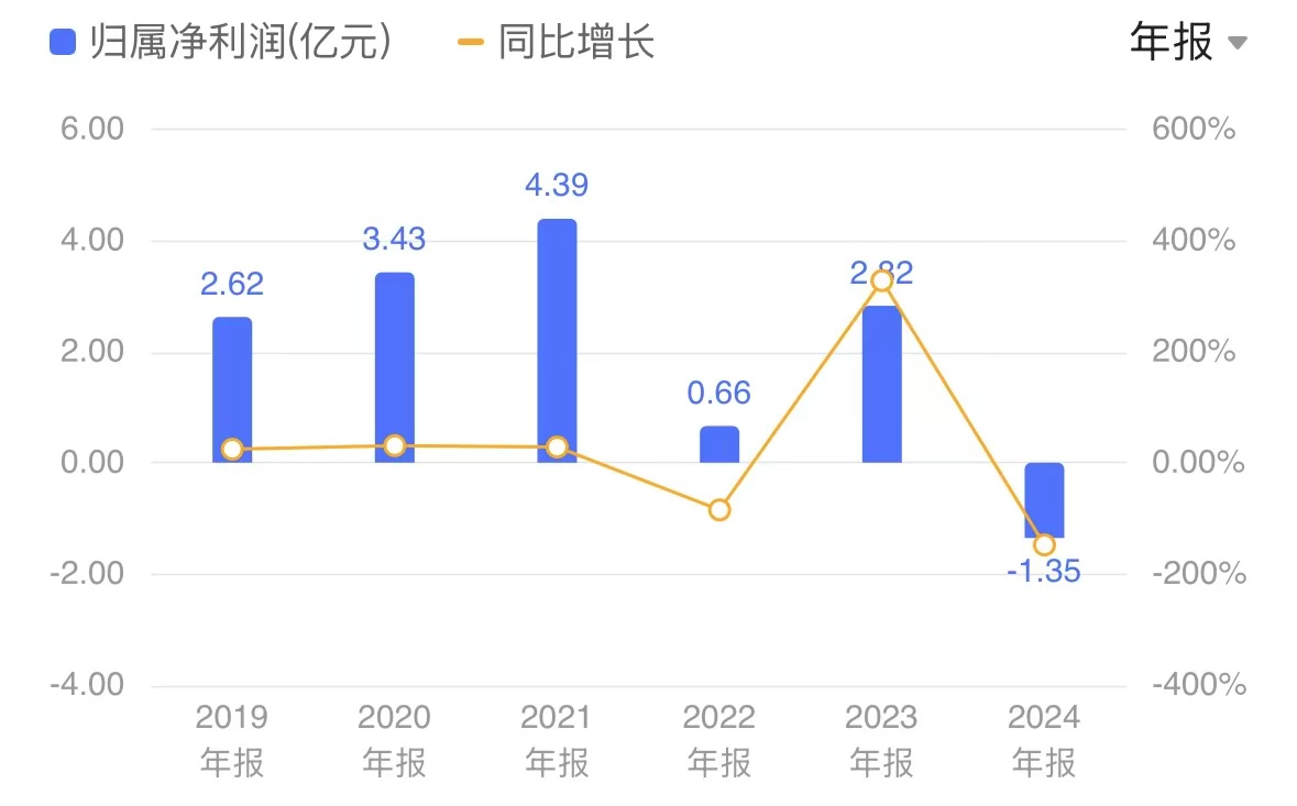 近几年,风语筑净利润波动较大。2022年、2023年及2024年公司净利润分别为6604.40万元、2.82亿元及-1.35亿元。