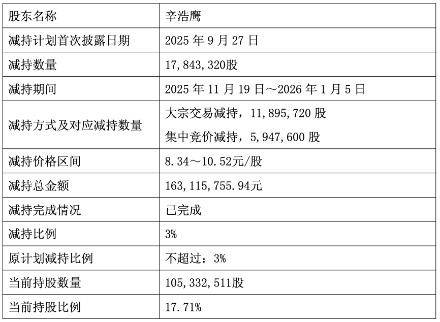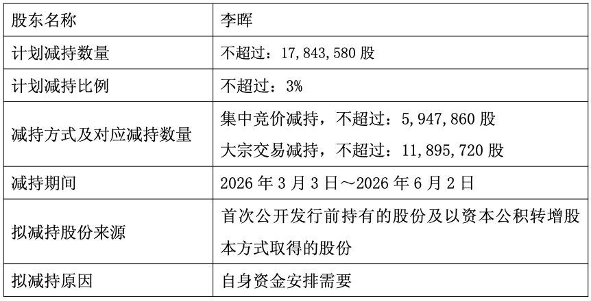 2025年8月9日,截至本公告披露日,李晖通过大宗交易方式减持了11,895,700股,约占公司总股本的2.00%;励构投资通过集中竞价方式减持了5,947,758股,约占公司总股本的1.00%。李晖为上海励构投资合伙企业(有限合伙) 执行事务合伙人。