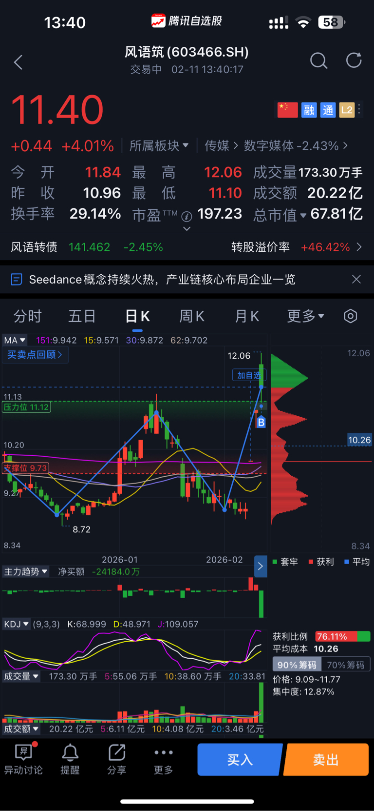 $风语筑(SH603466)$ 今天我感觉吧爆量分歧洗走前面获利盘一天都是横盘,所以果断买入明天即使跌停我也不会走的