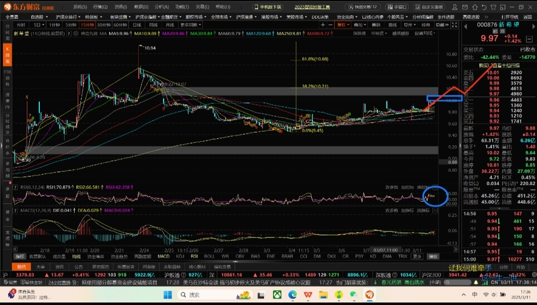 波浪尺是下一个点位在10.2附近,正好是补完缺口的位置,配合板块和期货的消化预期,板块走势趋同,新希望在这段时间应该是要走一波小碎步,在缺口这个位置震荡一到两天再考虑上攻。这两天可以在震荡低点大概9.9的位置加仓做t,拉高1%就可以卖,也算是点蝇头小利了。从结构上来说风险不大,我自己是满仓,所以可能就不怎么动了。