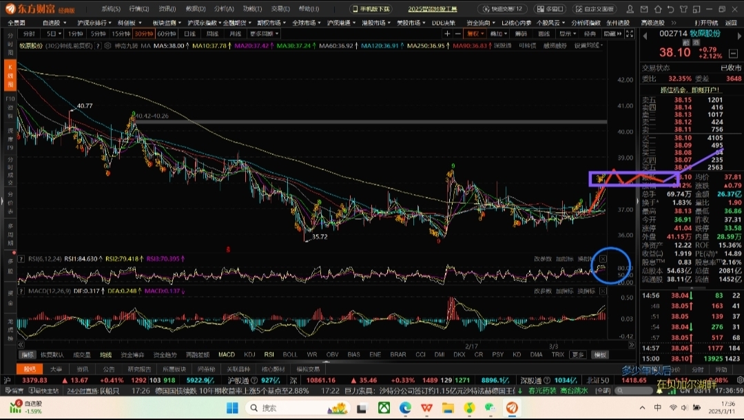 只能说终于是轮动到猪肉了。这是猪肉概念的30分钟周期图,今天放量中阳之后,日线进行加速,但是因为成交量还是不够大,所以rsi的白线在各个周期都触及高点,这种情况在横盘时一般是需要下跌修复的,但是在这种加速阶段,通常是进行横盘修复。价格正好也触及前方的套牢位置,所以预期是在蓝色方框里进行几天横盘消化,然后再上攻。