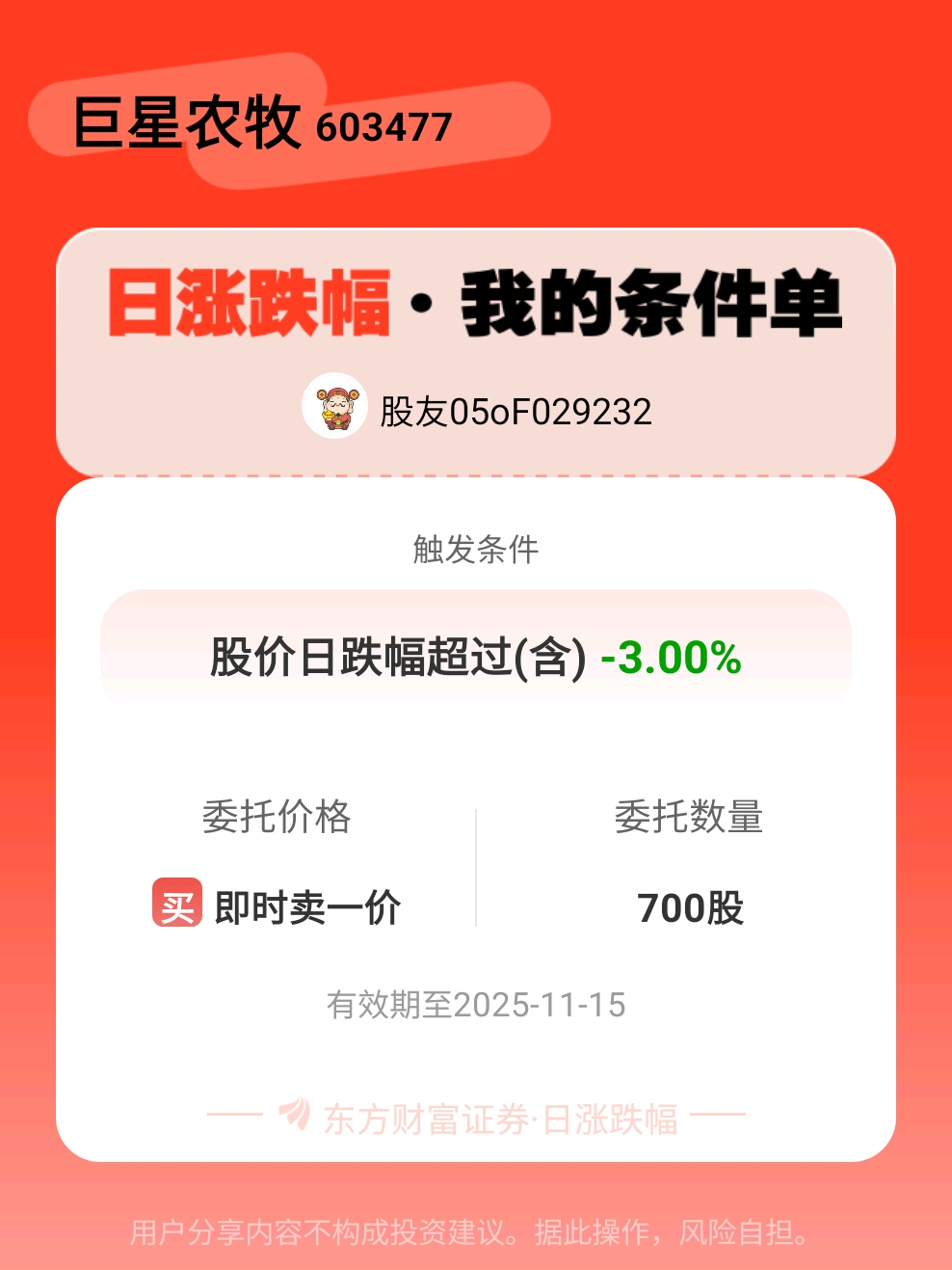 #条件单交流# #日涨跌幅晒单# 一位股神设置了一个日涨跌幅条件单,接下来就是见证奇迹的时刻~$巨星农牧(SH603477)$