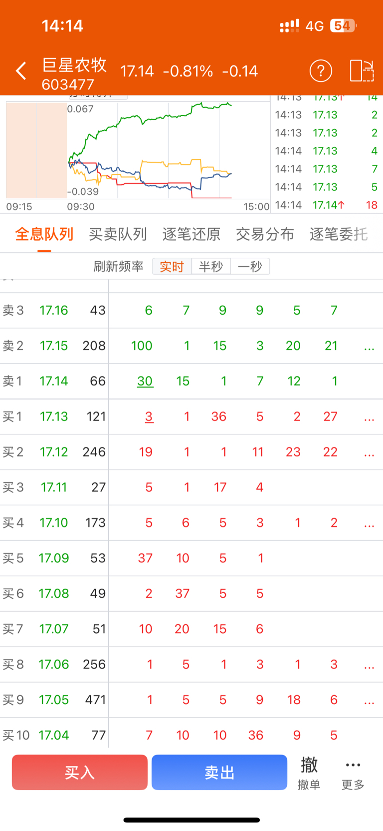 $巨星农牧(SH603477)$ 卖一一共几十手,挂了十分钟没卖出去,6