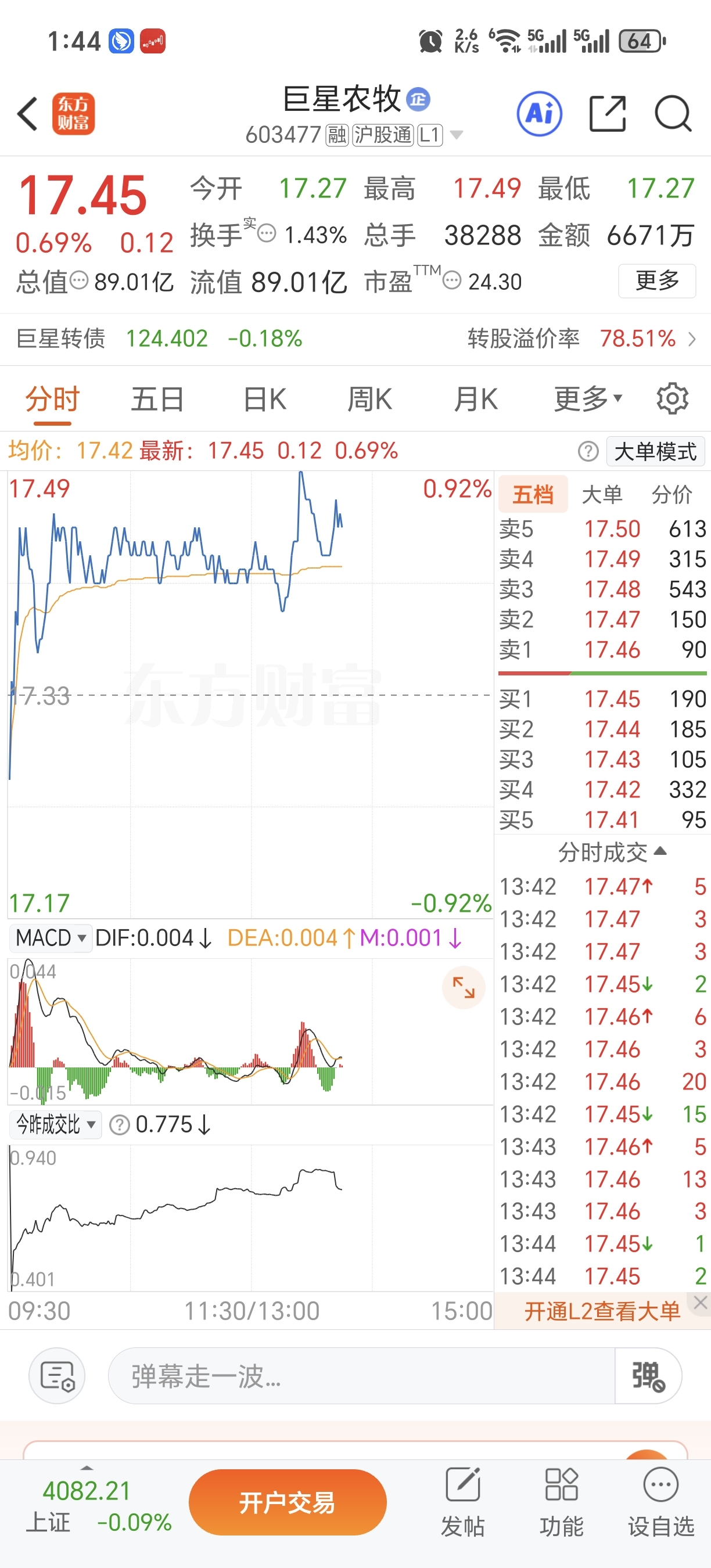 $巨星农牧(SH603477)$ 1:43,1分钟三笔成交,无人问津。