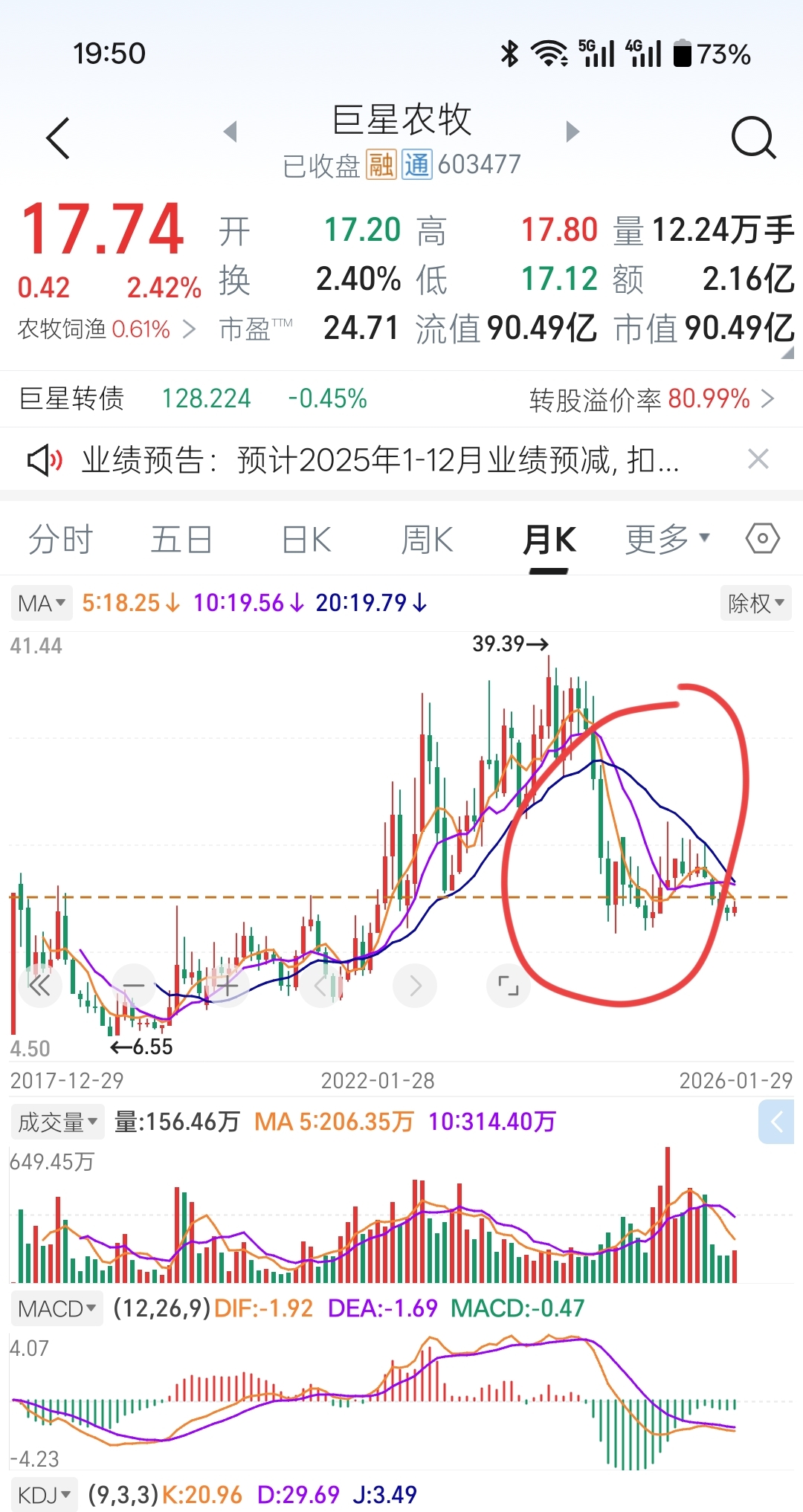 $巨星农牧(SH603477)$ 巨星月线走势大概率会参考2025年一季度,2-3-4月份其中一段时间,大概率会炒一波包含猪肉在内的农业板块,猪肉板块强不强或能不能延续炒作,其实主要是看产能去化进度,不符合预期炒一波就会熄火,巨星月线然后继续磨底,产能去化进度加快,整个板块2026年就有预期(3900万头存栏其实只是平衡点上限,要低于这个数,2025年底数据是3961万)