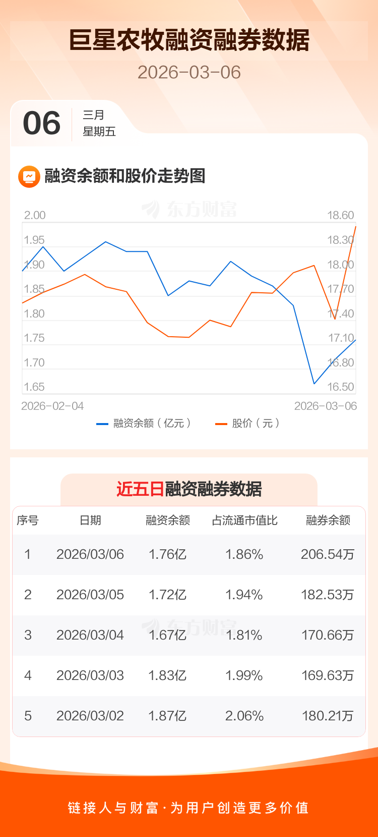 交易所最新数据显示,巨星农牧于2026年3月6日获融资买入3769.18万元,融资偿还3391.74万元,当日融资净买入377.44万元。目前,该股融资余额1.76亿,占流通市值比例为1.86%。