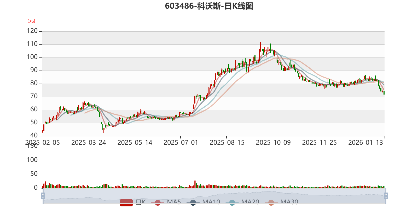 中证智能财讯科沃斯(603486)1月30日晚间披露2025年度业绩预告,预计2025年归母净利润17亿元至18亿元,同比增长110.9%-123.3%;扣非净利润预计16亿元至17亿元,同比增长123.4%-137.36%。以1月30日收盘价计算,科沃斯目前市盈率(TTM)约为23.1倍-24.46倍,市净率(LF)约4.82倍,市销率(TTM)约2.17倍。