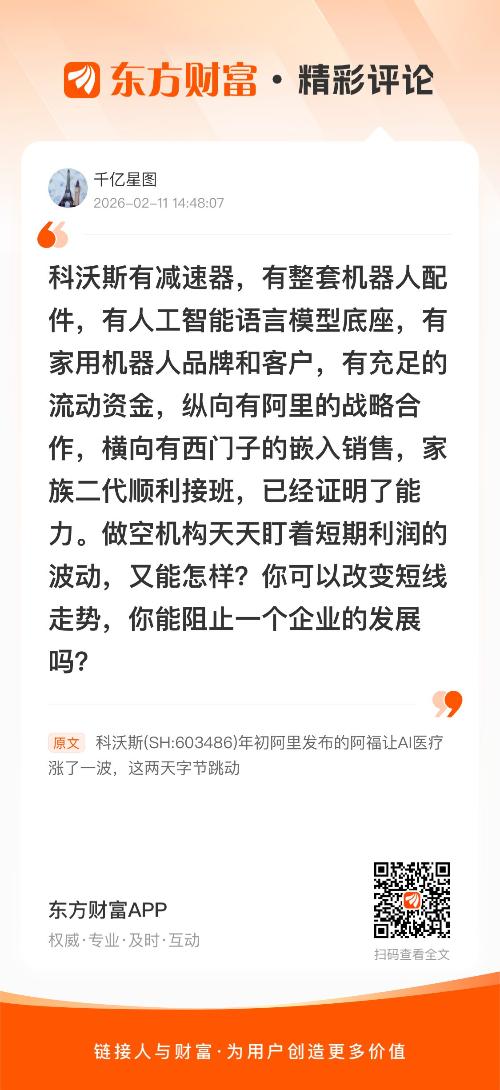 //@千亿星图 : 科沃斯有减速器,有整套机器人配件,有人工智能语言模型底座,有家用机器人品牌和客户,有充足的流动资金,纵向有阿里的战略合作,横向有西门子的嵌入销售,家族二代顺利接班,已经证明了能力。做空机构天天盯着短期利润的波动,又能怎样?你可以改变短线走势,你能阻止一个企业的发展吗?