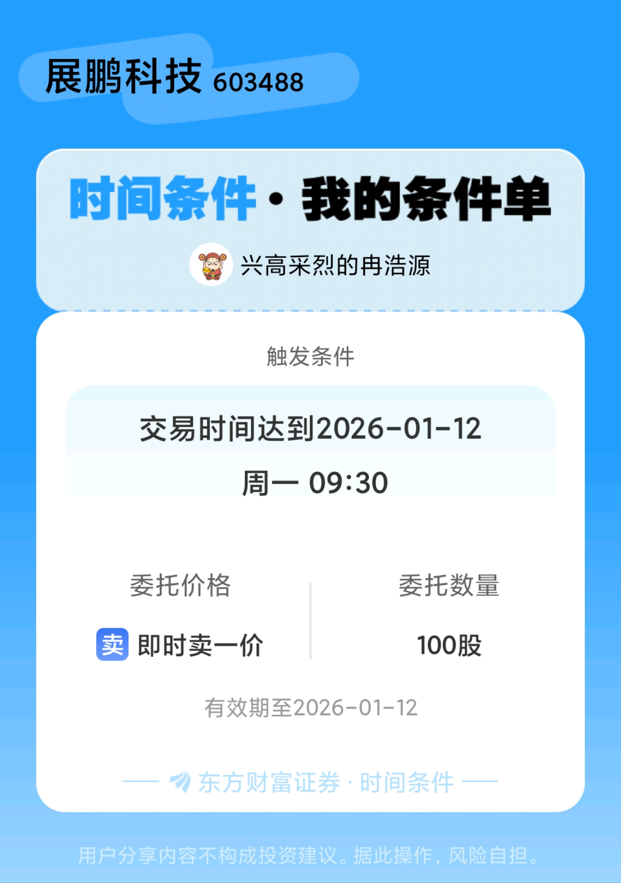 #条件单交流# #时间条件晒单# 一位股神设置了一个时间条件条件单,接下来就是见证奇迹的时刻~$展鹏科技(SH603488)$