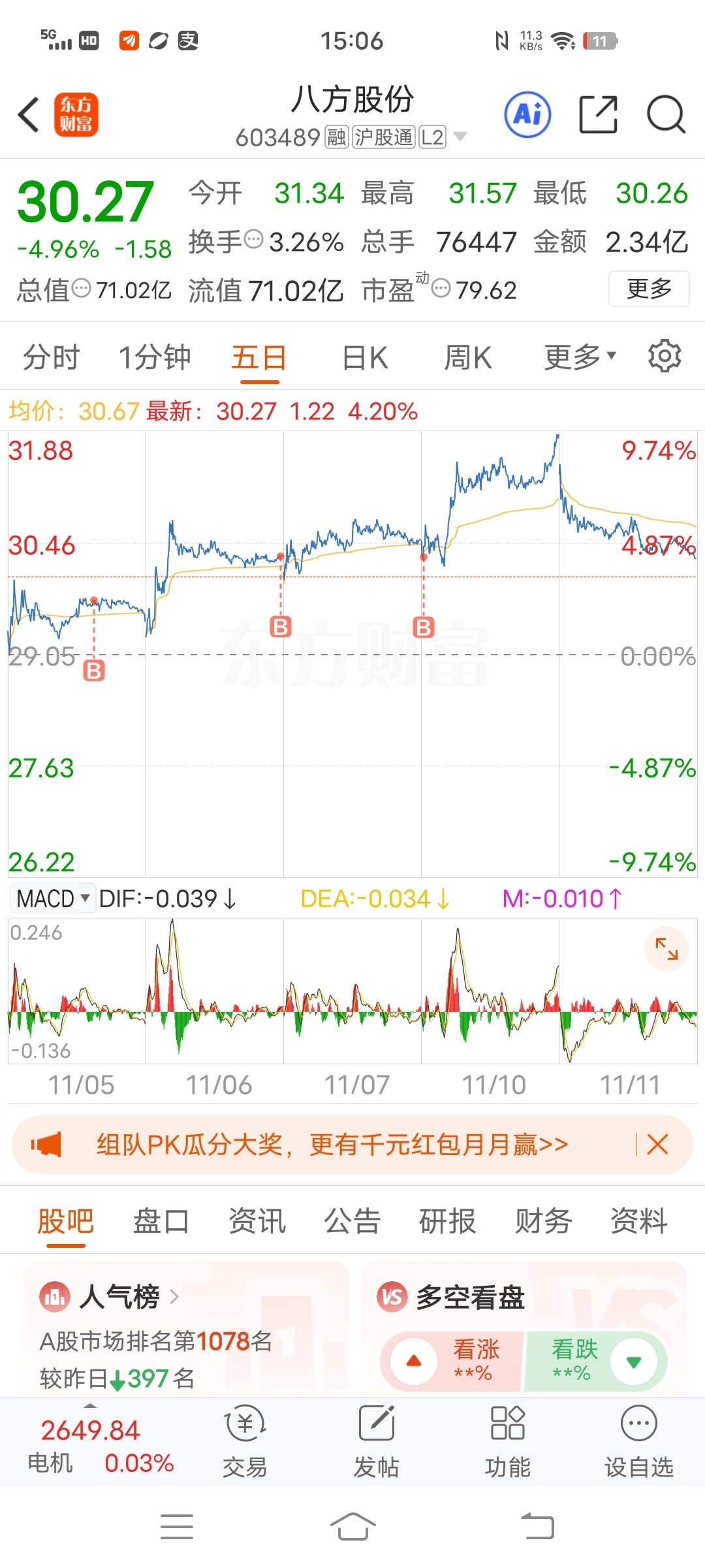 $八方股份(SH603489)$ 不加仓了明天确认一下,看他到底是往上走还是往下走