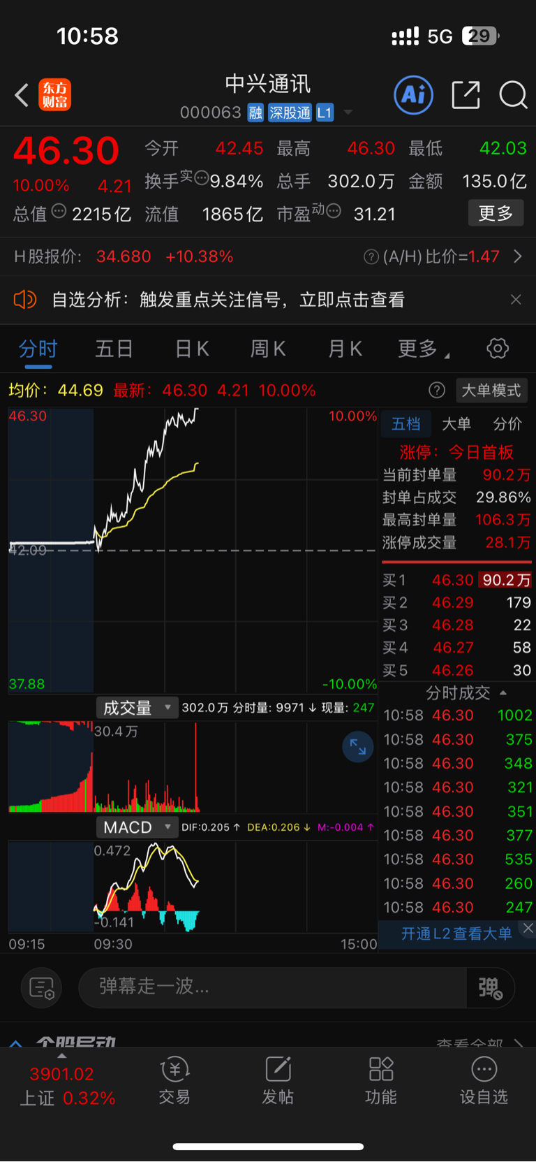 还好周五卖了,中兴通讯眼看着板了没资金买了