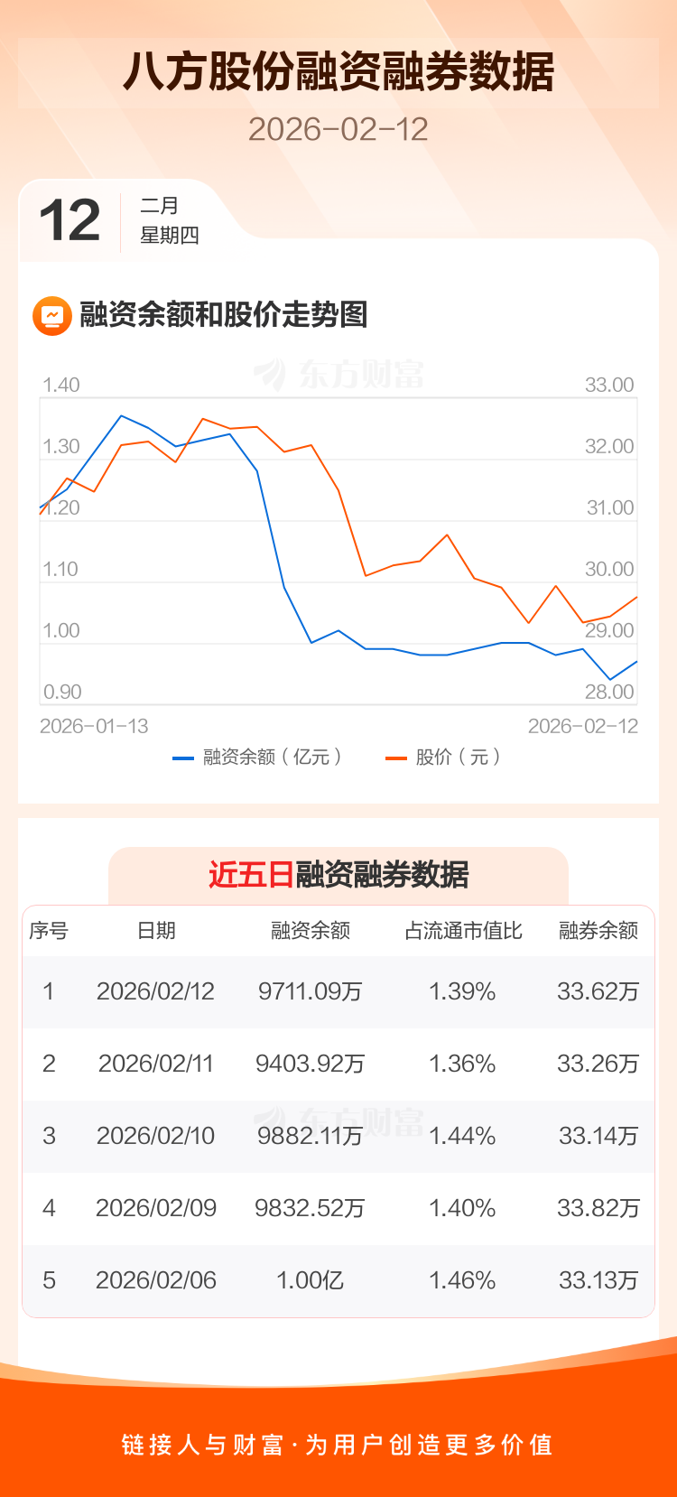 交易所最新数据显示,八方股份于2026年2月12日获融资买入619.61万元,融资偿还312.44万元,当日融资净买入307.18万元。目前,该股融资余额9711.09万,占流通市值比例为1.39%。