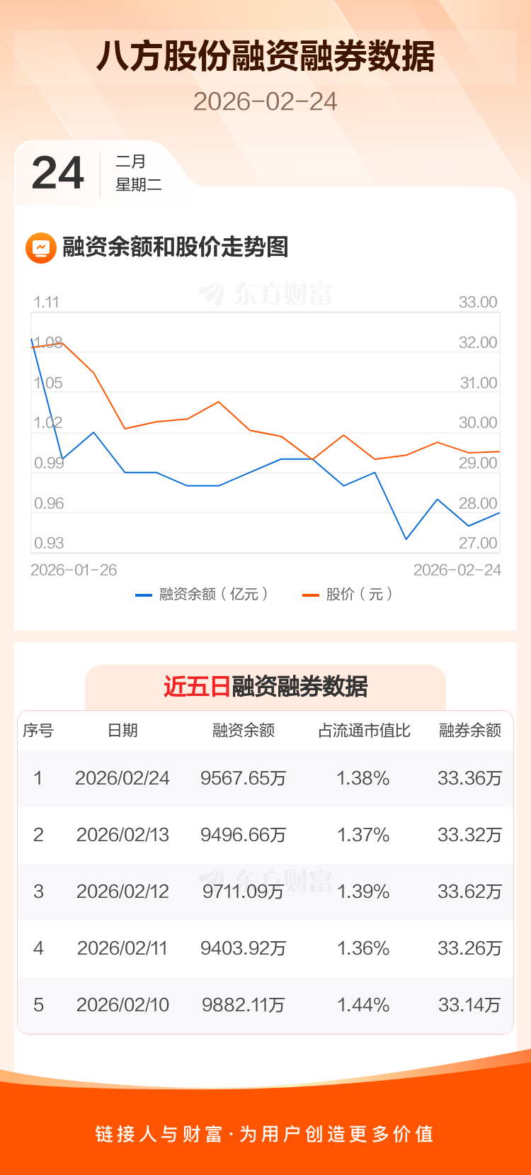 交易所最新数据显示,八方股份于2026年2月24日获融资买入525.29万元,融资偿还454.29万元,当日融资净买入71万元。目前,该股融资余额9567.65万,占流通市值比例为1.38%。