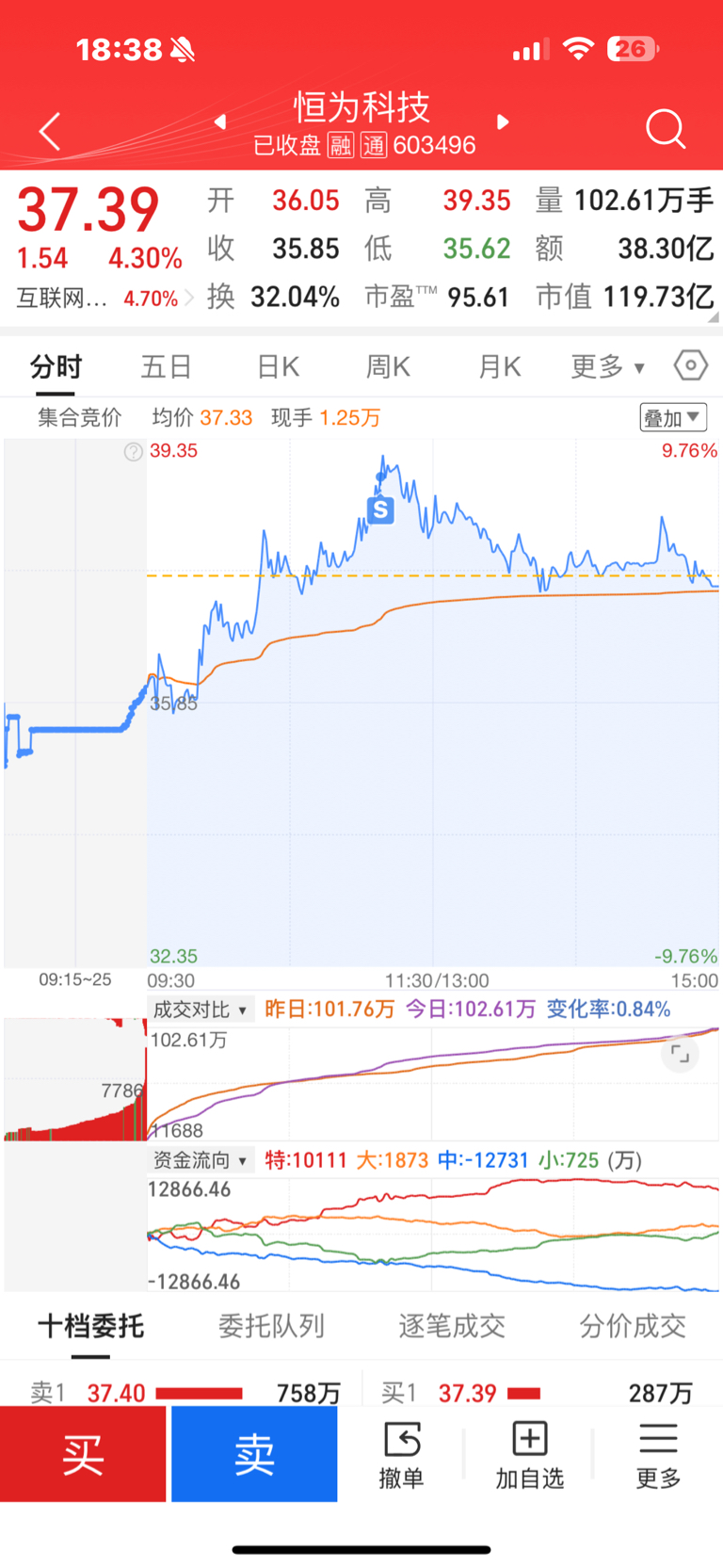 $恒为科技(SH603496)$ 幸好昨天止盈,估计又要调整几天了