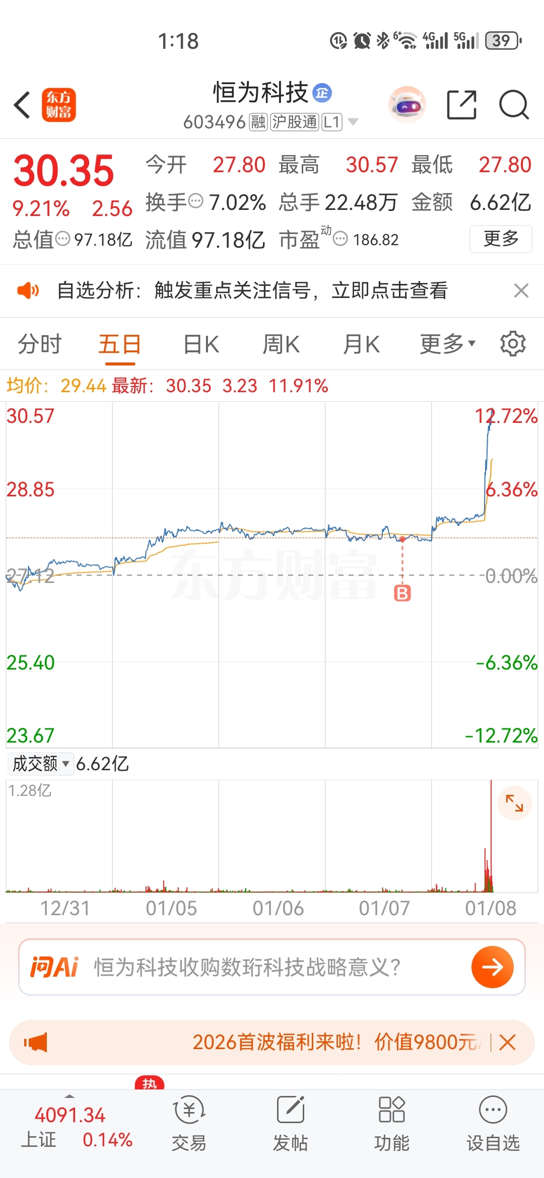 $恒为科技(SH603496)$ 精准抄底,坐好扶稳!