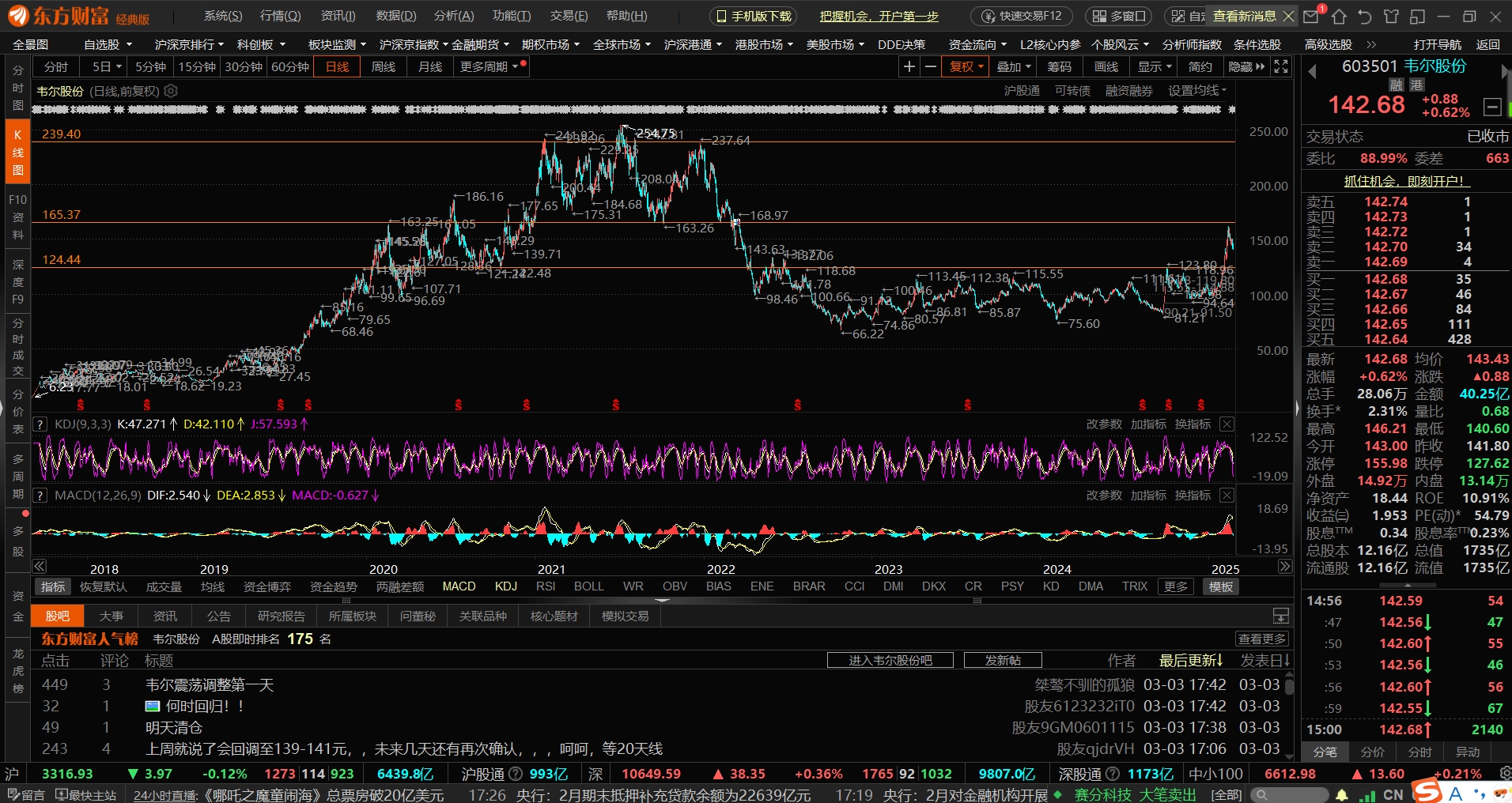 $韦尔股份(SH603501)$ 不知还有老粉记得这张图片吗,因为好久没有用电脑看盘,刚刚打开在分析的时候,看到当时画的不太标准的图,其实是正确的,只是时间太久,自己也忘记当时对韦尔走势的判断了,这次从130开始减仓,确实是有问题了