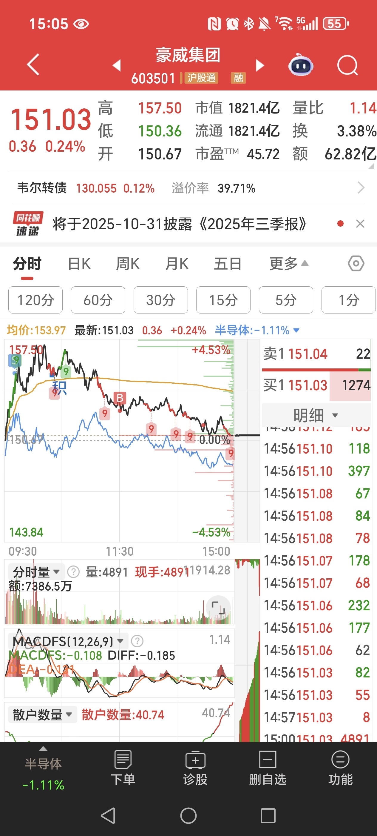 豪威也持有一段时间了。第一波119到136清的,第二波141进来的吃了三个大阴线