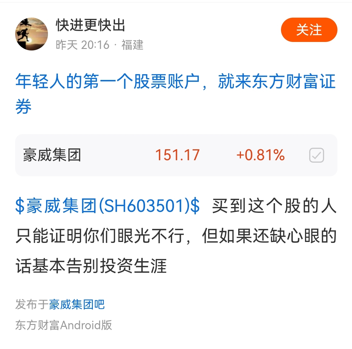 温馨提示: 1.根据《证券法》规定,禁止编造、传播虚假信息或者误导性信息,扰乱证券市场;2.用户在本社区发表的所有资料、言论等仅代表个人观点,与本网站立场无关,不对您构成任何投资建议。用户应基于自己的独立判断,自行决定证券投资并承担相应风险。《东方财富社区管理规定》