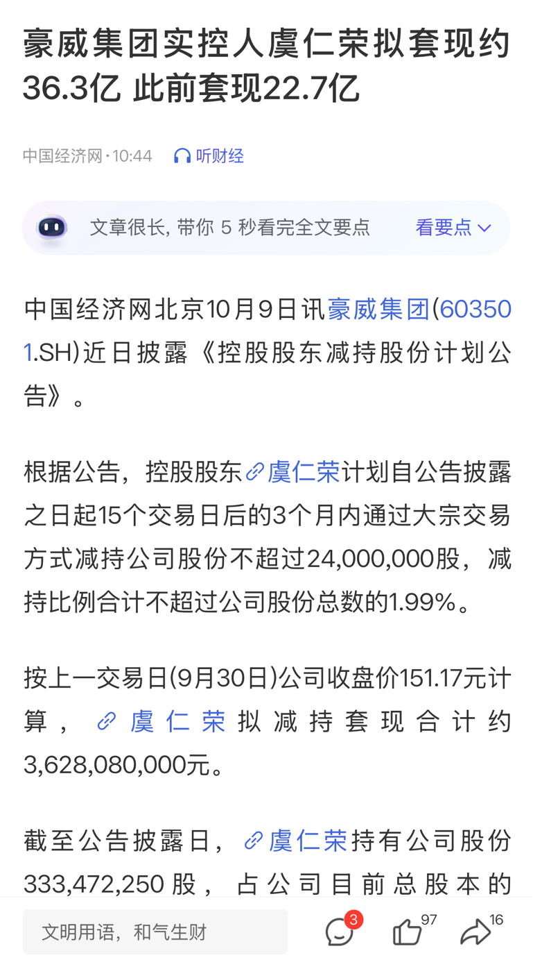 $豪威集团(SH603501)$ 股票本身不错,但没想到实控人董事长接连高位套现,减持。试想如果董事长实控人都不看了你有什么理由看好?